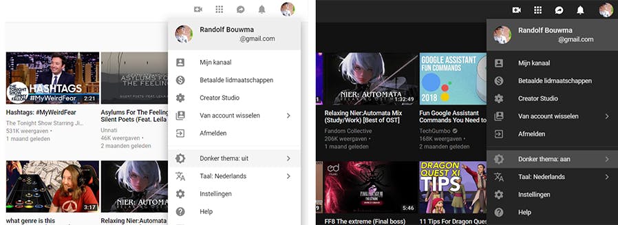 Kijk je meestal YouTube-video's op je pc, dan is het donkere thema ook in te stellen in je browser. Je hoeft niet ver te zoeken, maar je moet het wel even vinden. Klik wederom op je profielfoto bovenin, en je ziet de optie gelijk staan: