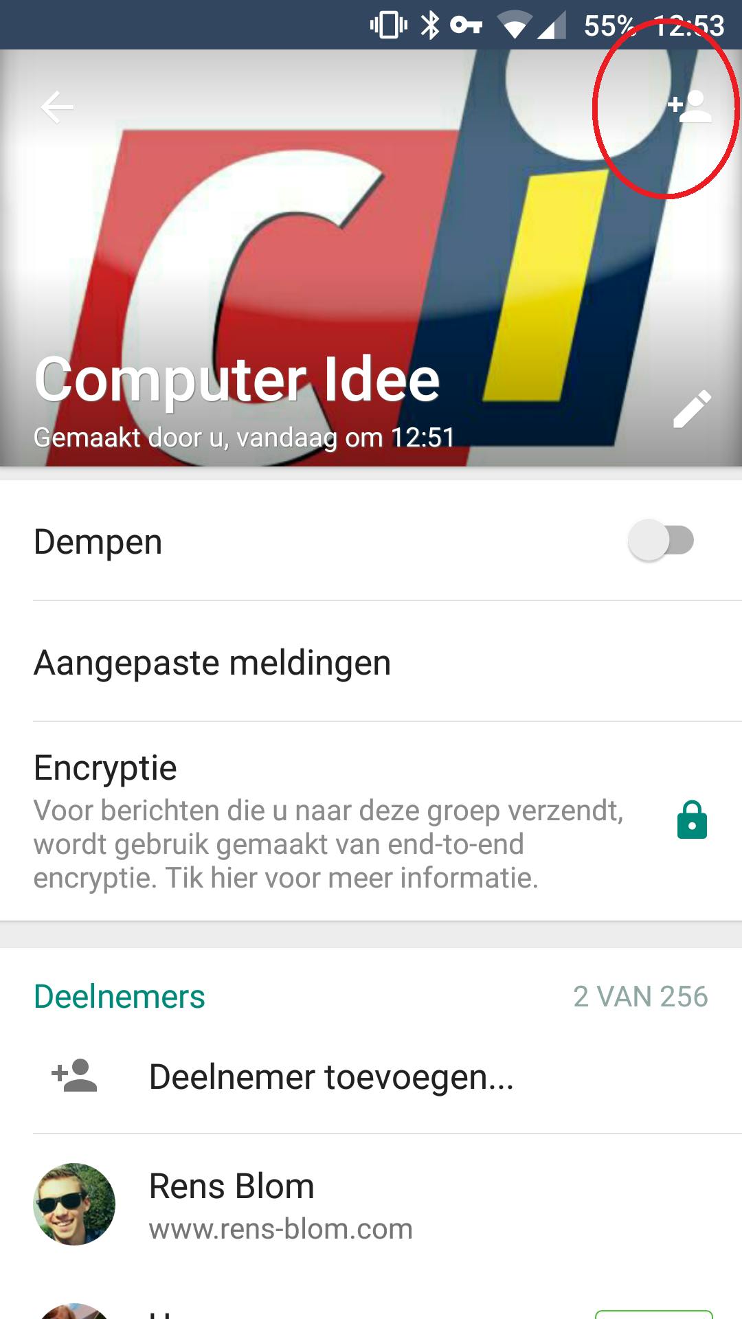 Klik op de naam van de groep, en je komt in het volgende scherm uit. Hier kun je onder andere je gesprekspartners zien, of de eind-tot-eind-encryptie aan staat, en je kunt er berichten mee dempen.