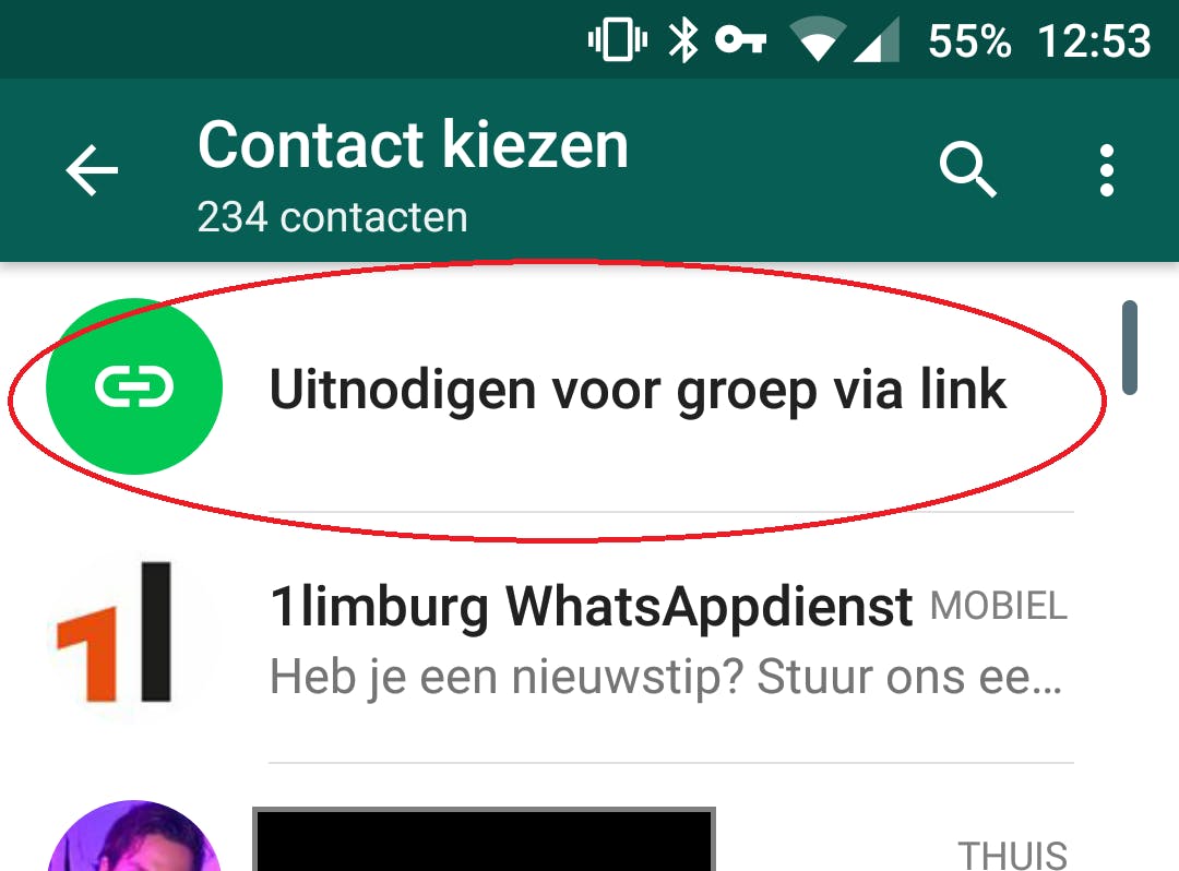 Je krijgt hier een lijst te zien met al je contactpersonen. Daarmee kun je andere personen toevoegen aan het gesprek. Bovenaan staat echter de optie die we hier moeten hebben: 'Uitnodigen voor groep via link'.