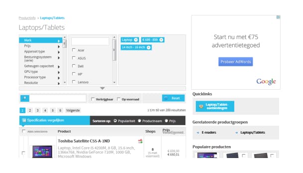 Standaard worden ook tablets getoond, dit kun je uitschakelen door bij het filter Apparaat type de optie Laptop aan te vinken. Vervolgens kun je de zoekresultaten nog verder verfijnen door onder andere te filteren op schermdiagonaal, resolutie en uiteraard prijs. Zo heb je snel een idee wat er te koop is binnen jouw budget en wensen.