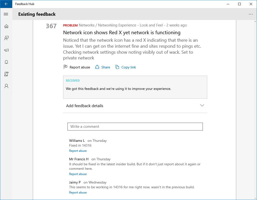 De Feedback Hub is gemaakt door Microsoft zodat vroege bèta-testers hun feedback kunnen geven op nieuwe functies. Wie Windows 10 al vóór de officiële lancering gebruikte, kon dan ook aangeven waar zij tegenaan liepen.