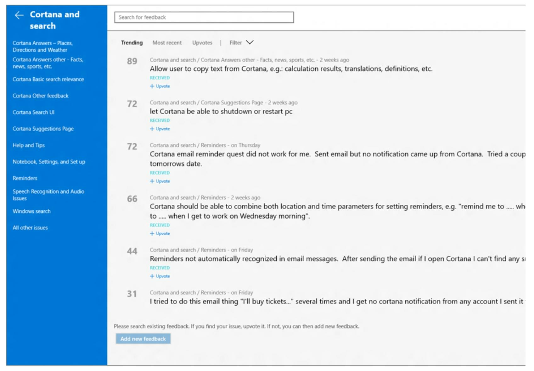Om structuur aan te brengen in de grote aantallen issues heeft Microsoft een stemmingssysteem toegevoegd. Als je in de lijst met onderwerpen kijkt, zie je het woordje 'Upvote' staan. Daarmee kun je een extra stem geven, waarmee je laat blijken dat je een issue belangrijk vindt.