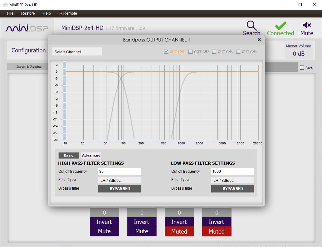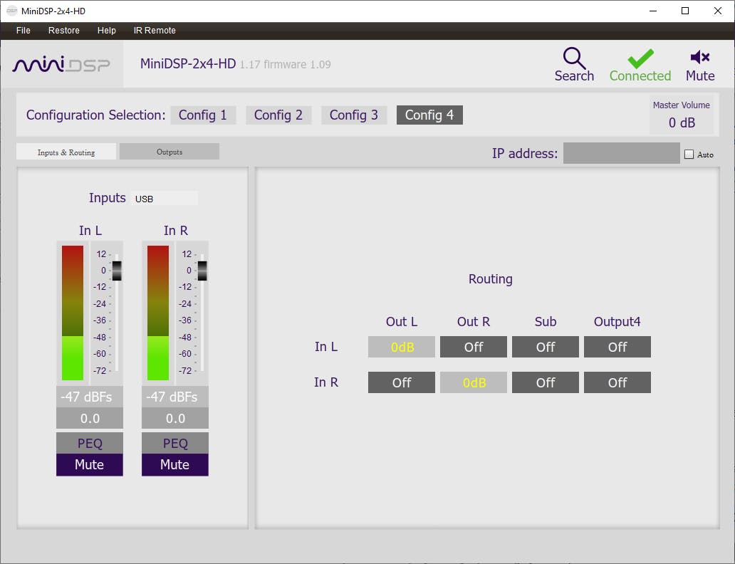 Open het configuratiepaneel en klik op Connect om verbinding te maken met de miniDSP. Voor de zekerheid kun je via Restore / Factory Default terug naar de fabrieksinstellingen. Let op dat daarbij standaard een crossover is ingesteld. We lopen de instellingen daarom even door en beginnen met het instellen en aansluiten van de hoofdluidsprekers.