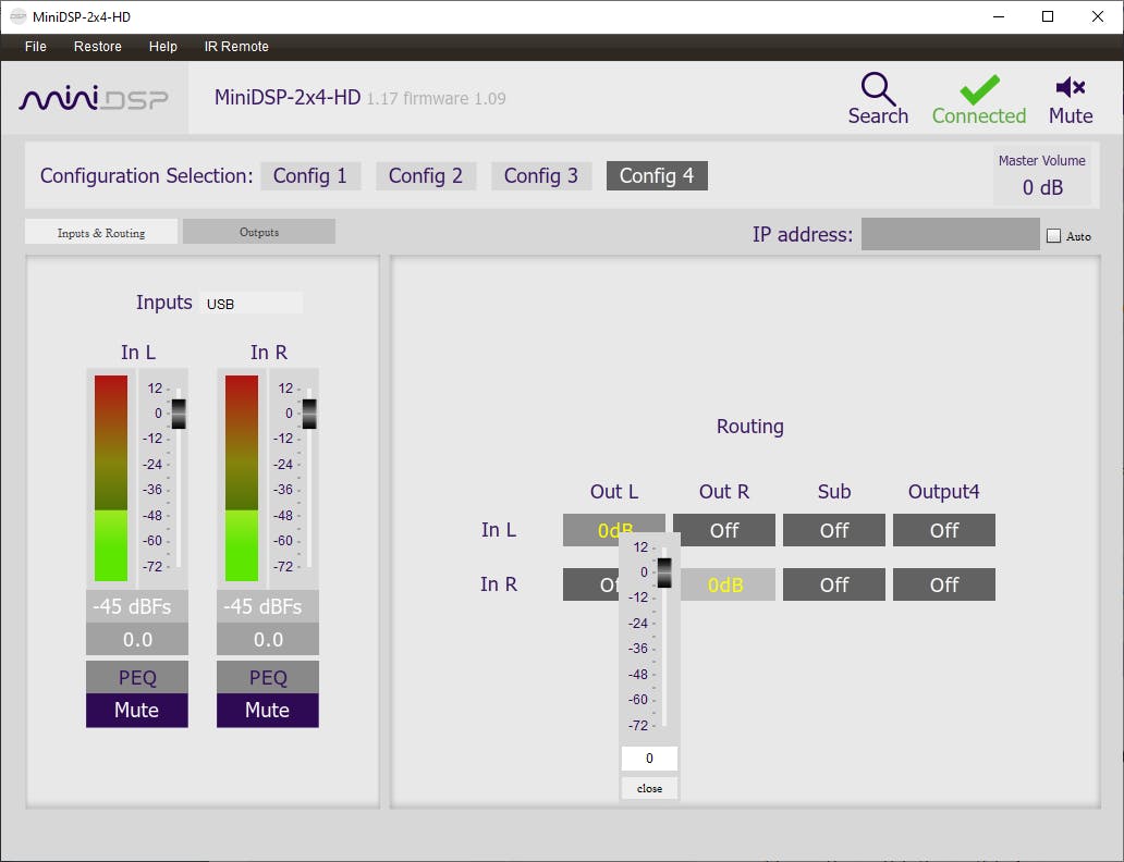 Dit is een goed moment om wat muziek af te spelen via de usb-verbinding. Onder Input & Routing selecteer je daarvoor bij Inputs de optie USB. Als het niet lukt, zorg dan dat in Windows of je muziekspeler de miniDSP als uitgang is ingesteld.