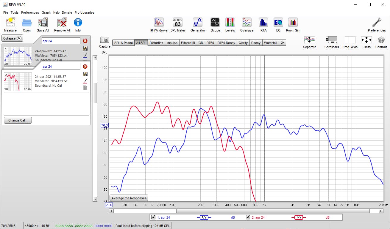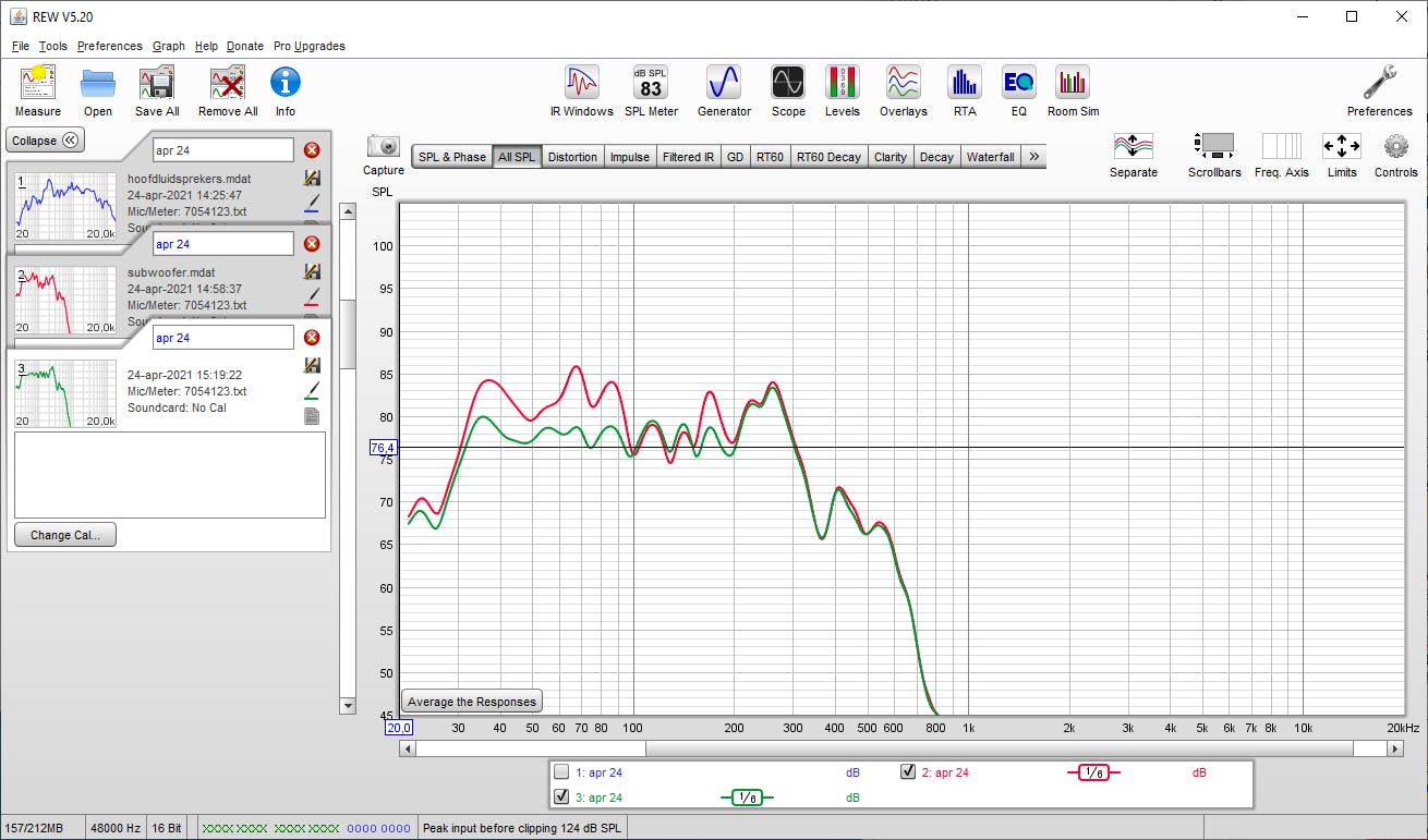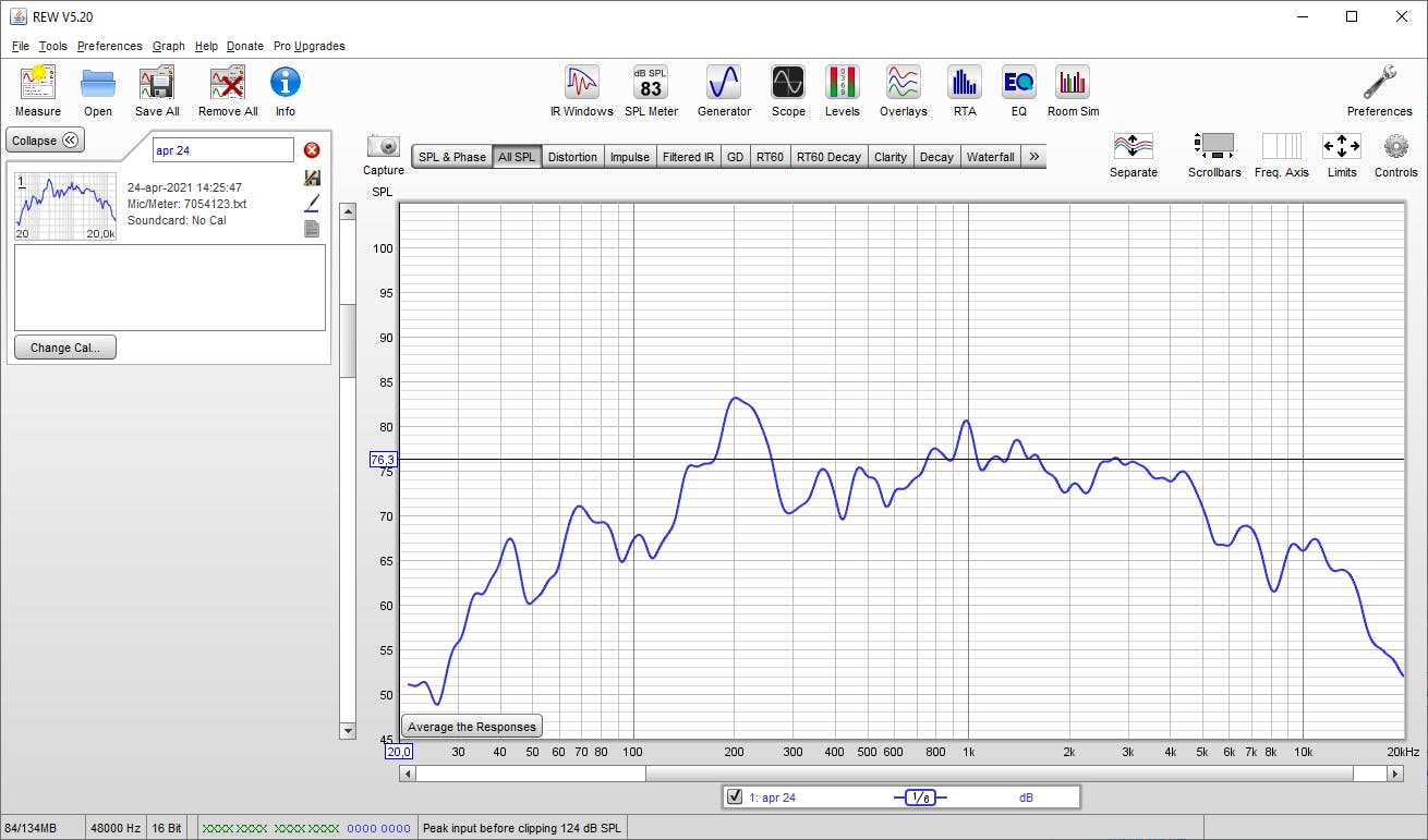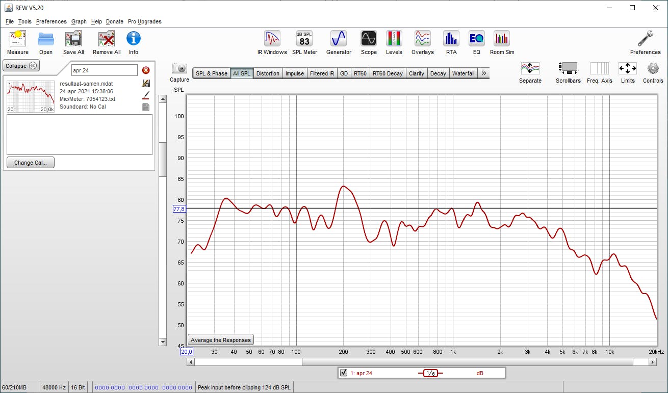 Er wordt nu een testtoon afgespeeld, ook wel ‘sweep’ genoemd, via de gekozen luidspreker. Daarna zie je op het tabblad All SPL de frequentierespons. Kies in het menu Graph voor 1/6 smoothing om het wat leesbaarder te maken. Het zal in dit geval duidelijk zijn dat een subwoofer een goede toevoeging kan zijn, omdat de lage frequenties achterblijven.