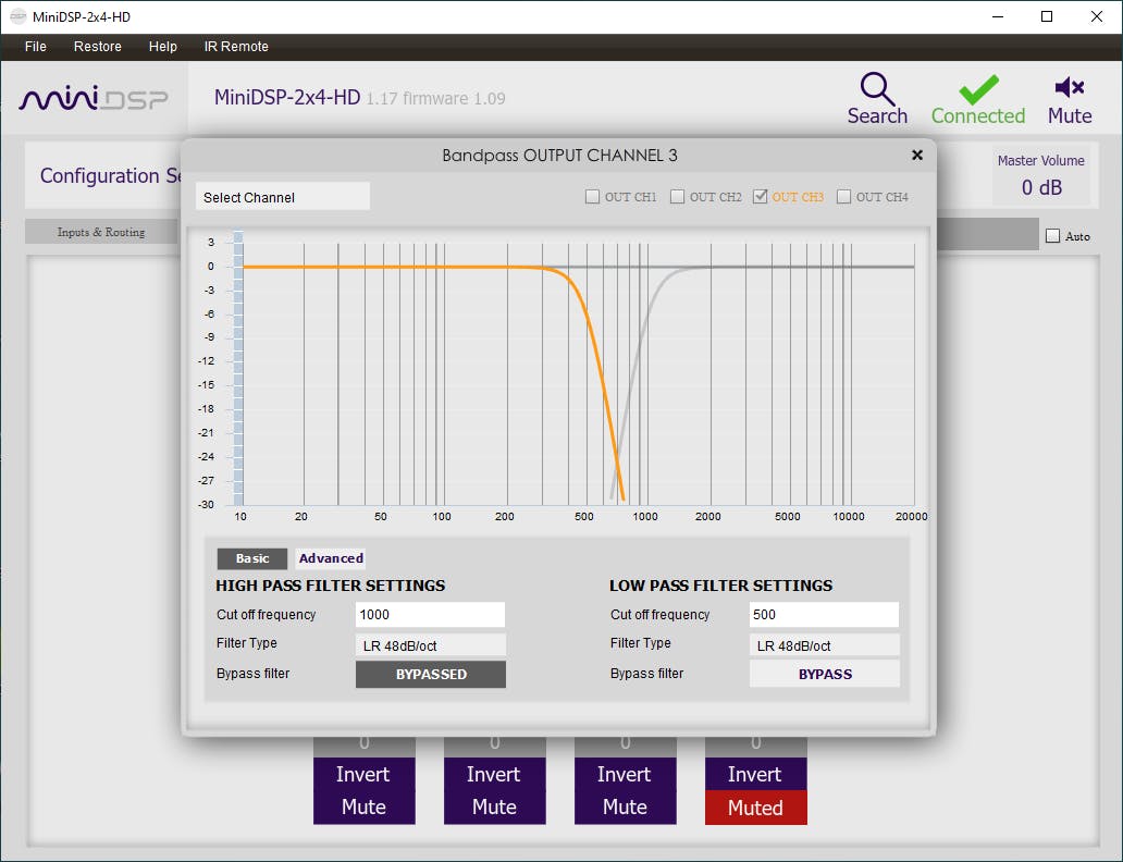 In het controlepaneel van miniDSP, op het tabje Inputs & Routing, klikken we in de kolom Sub bij zowel In L als In R op het vakje, zodat de twee kanalen worden gemixt naar deze subwooferuitgang. Klik dan op Xover. Om de subwoofer te beschermen, gaan we in eerste instantie alleen frequenties tot 500 Hz doorgeven. Onder High Pass Filter Settings moet Bypassed staan en bij Low Pass Filter Settings vullen we 500 als frequentie in en zorgen dat er Bypass staat.