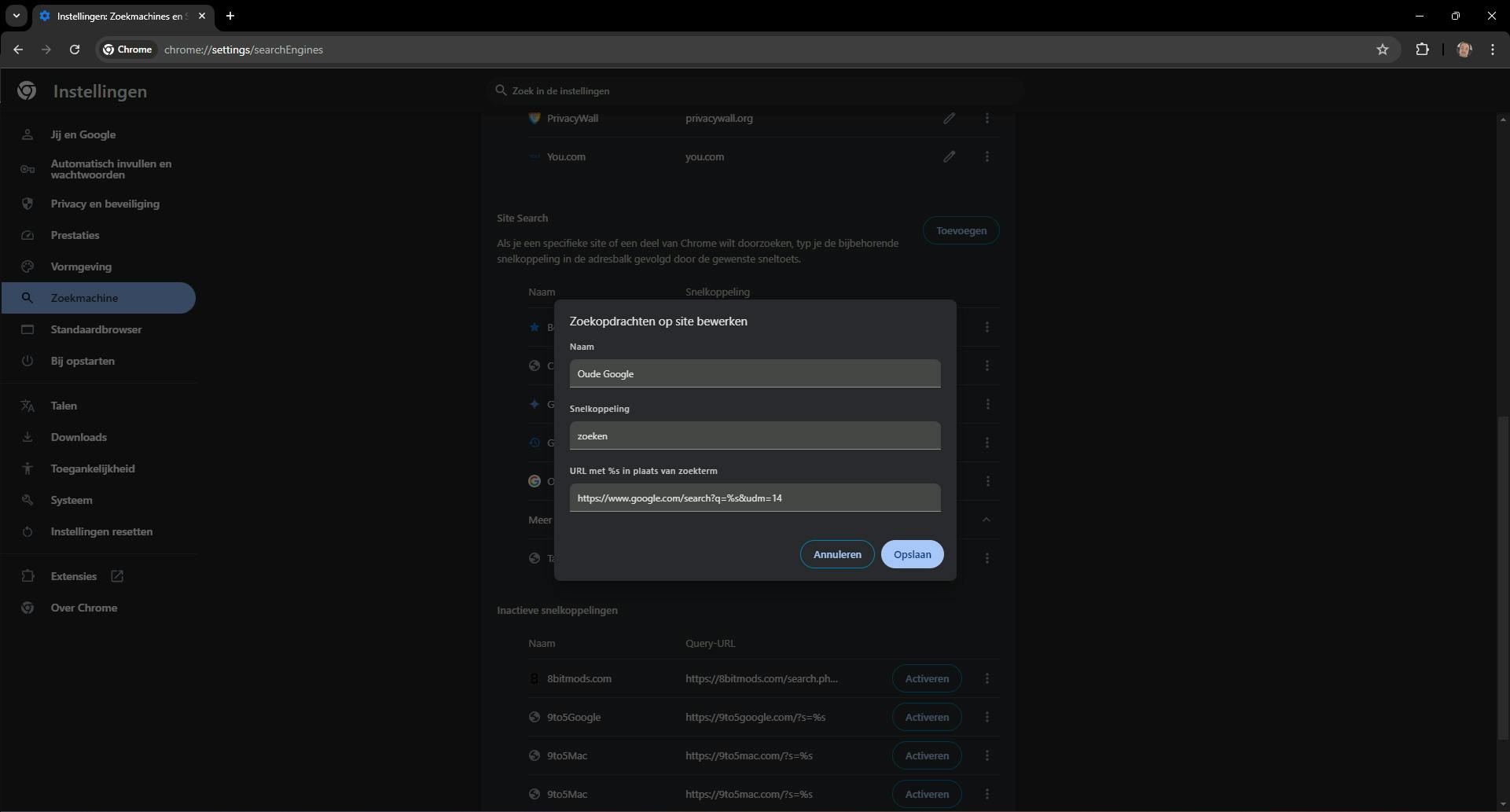 - Vul in het pop-upvenster de volgende gegevens in; een naam voor je ‘oude’ zoekmachine, een snelkoppeling (wij kozen voor ‘zoeken’ en onderin de volgende url: https://www.google.com/search?q=%s&udm=14