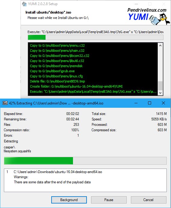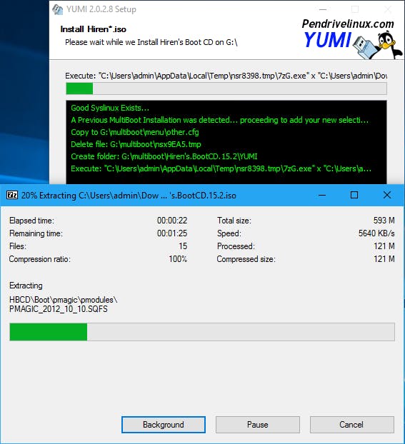 Vervolgens druk je op de Create-knop en op Ja zodat YUMI aan de slag kan. Afhankelijk van de grootte van het distributiebestand kan dit proces wel even duren. Normaliter verschijnt een tweede venster waarin het iso-bestand wordt uitgepakt: druk dan op de Close-knop zodra die beschikbaar komt. Even later druk je dan op Next en beantwoord je de vraag Would you like to add more ISOs/Distros Now on X:? met Ja (hoewel je dat ook altijd nog later kunt doen).