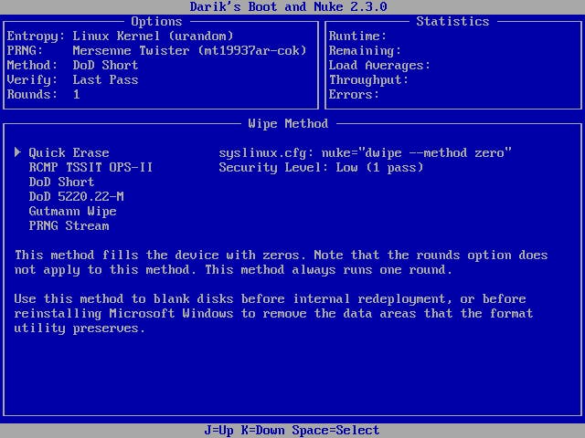 Zodra je deze tool opstart beland je op de opdrachtprompt bij ‘boot:’. Zorg dat het medium dat je wilt shredden is aangesloten en druk gewoon op de Enter-toets. DBAN speurt nu naar de aangesloten opslagapparaten en presenteert je die in een lijst. Met de pijltjestoetsen ga je naar het juiste (!) medium en druk je op de spatiebalk: je ziet nu [wipe] verschijnen naast dit medium. In principe hoef je nu maar op F10 te drukken om het geselecteerde opslagapparaat te shredden, maar als je dat verkiest kun je via de M-toets eerst nog de wipe-methode instellen. In principe heb je al voldoende aan de snelste methode: Quick Erase.
