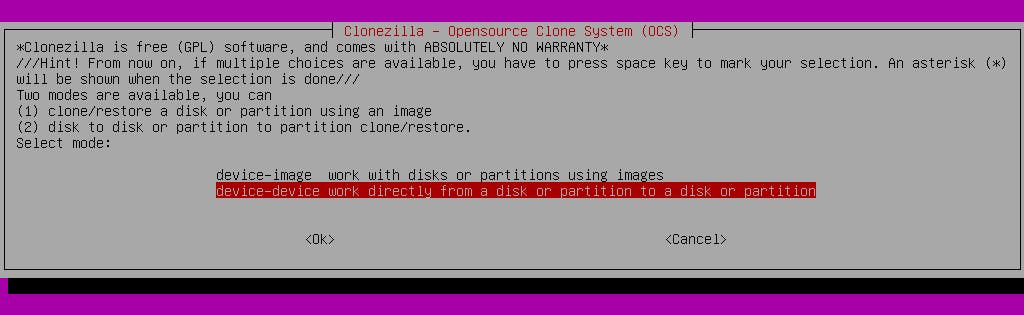 In het opstartmenu van Clonezilla kun je voor Clonezilla live (Default settings, VGA 800x600) opteren, maar via de Other modes of Clonezilla live komen andere opstartmodi beschikbaar, met andere resoluties maar ook met een Failsafe mode. Selecteer de gewenste taal (English, wellicht) en klik op Select keymap from arch list om de toetsenbordindeling in te stellen. Vervolgens kies je Start_Clonezilla. Gezien het om een (fysieke) kloonoperatie gaat opteren we in het volgende menu voor device-device.