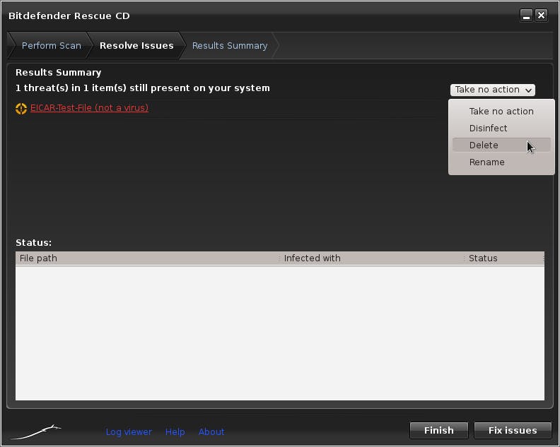 Botst de tool inderdaad op malware, dan wordt die op het einde opgelijst. Dubbelklik op zo’n item om uit te vissen waar dat precies gelokaliseerd is. Via het uitklapmenu bij Take no action geef je aan wat er met die (potentiële) malware precies moet gebeuren: Disinfect, Delete of Rename. Probeer het eerst met Disinfect. Lukt het niet, dan zal Bitdefender het bestand normaliter zelf verwijderen. Heb je de gewenste actie(s) geselecteerd, dan voer je die uit via de knop Fix issues. Rond af met Finish en Done. Hopelijk is je systeem nu weer helemaal virusvrij!