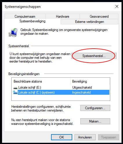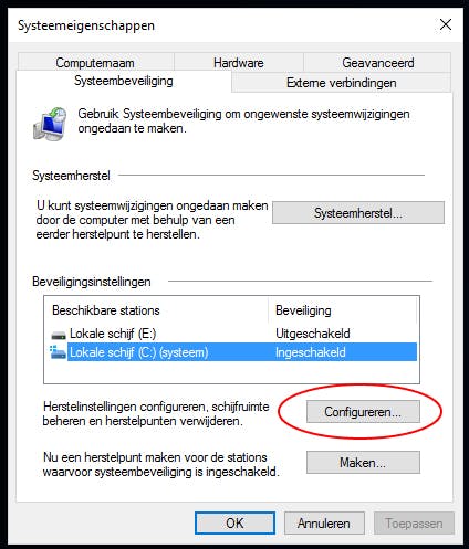 Ga naar het startmenu en typ herstelpunt om de optie een herstelpunt maken te vinden. Klik er op om het Systeembeveiliging-venster te openen. Onder Beveiligingsinstellingen zie je je beschikbare schijven staan. Kies er eentje en klik op Configureren.