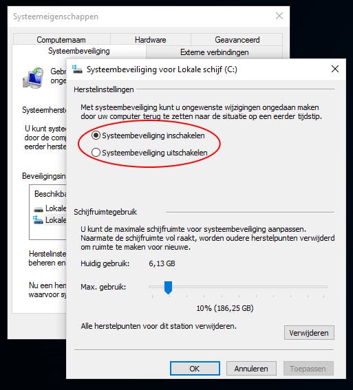 In het volgende venster kies je voor Systeembeveiliging inschakelen. Onder schijfruimtegebruik bepaal je hoeveel ruimte Windows in beslag kan nemen voor backups. Dat hangt weer af van de hoeveelheid beschikbare ruimte op je schijf. Klik nu op OK.