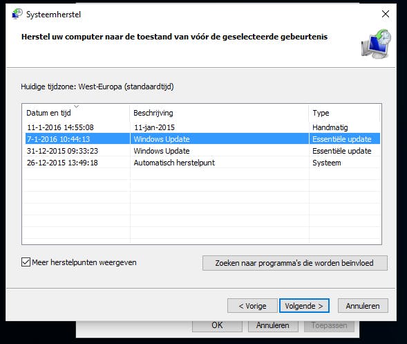 Om bij herstelpunten te komen kies je in het venster voor Systeembeveiliging voor Systeemherstel. Klik eerst op Volgende om een lijst met herstelpunten te zien. Kies er eentje met een enkele klik en druk op Volgende, vervolgens op Voltooien.