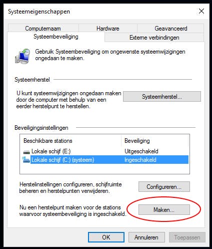 Geef het herstelpunt een naam en kies wederom voor Maken. Dit kan een poosje duren, maar daarna ben je klaar.