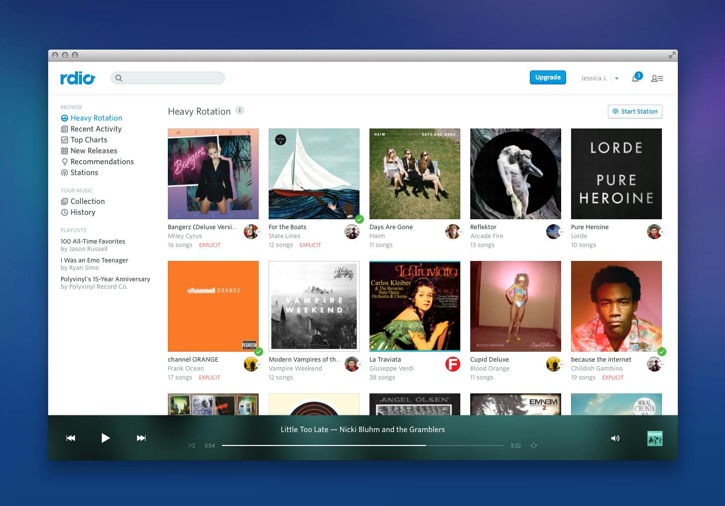 Rdio is het onbekende broertje van Spotify, maar doet absoluut niet onder voor de bekende streamingdienst. Sterker nog, Rdio is in veel opzichten beter dan Spotify. Er staan ongeveer hetzelfde aantal nummers op (al is het wel lastiger om onbekendere artiesten te vinden), en het navigeren is kinderlijk eenvoudig. Net als bij Spotify heb je ook bij Rdio de keus tussen een gratis en een betaalde variant - die laatste kost 10 euro per maand.