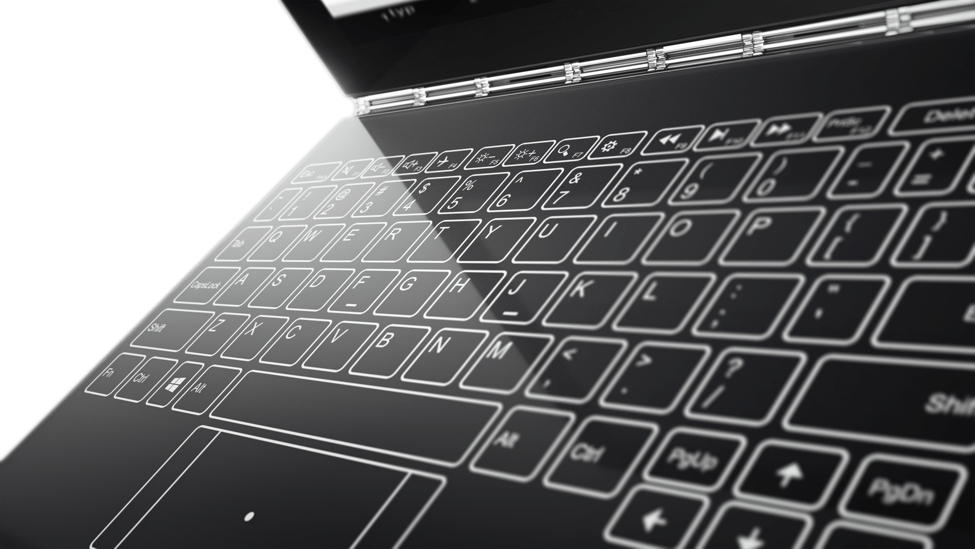 Het is echter ook mogelijk om met de Yoga Book te typen, ongeveer zoals je dat gewend bent. De touchpad kan namelijk oplichten met een toetsenbordindeling. Wanneer je typt krijg je haptische feedback (een lichte trilling, zodat je kunt voelen of je de 'toets' goed hebt 'ingedrukt'). Alleen ben je dus op een plat oppervlak aan het typen.