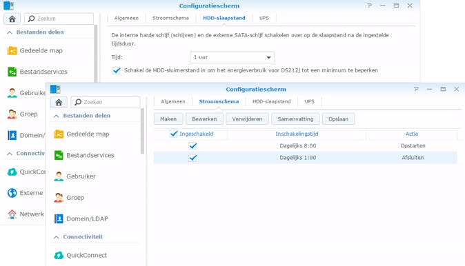 Als extra aanvulling kun je je NAS ook automatisch laten in/uitschakelen, bijvoorbeeld als weet dat je je NAS nooit voor 8:00 uur 's morgens en na 1:00 uur 's nachts gebruikt. Met deze instelling schakel je je NAS zomaar zeven uur per etmaal uit en dat levert een energiebesparing op van bijna 30%. De instelling vindt je in DSM bij Configuratiescherm / Hardware en stroom / Stroomschema.