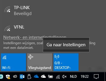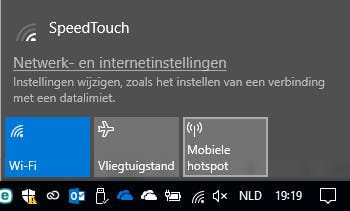 In de Creators Update van Windows 10 is het eenvoudiger geworden om een wifi-hotspot op te zetten. Ga met je muis naar rechts onder op de taakbalk en klik op je netwerkpictogram. Als het mogelijk is om je huidige netwerkverbinding (dat kan zowel draadloos als via een vaste netwerkverbinding) te delen, zie je daar het pictogram Mobiele hotspot staan.