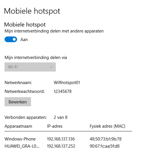 Een wachtwoord opgeven is overigens altijd verplicht, je kunt ‘m niet leeg laten. En er wordt gebruik gemaakt van het WPA2-protocol en kun je verder niet aanpassen. Eenmaal ingeschakeld kunnen apparaten als smartphones en tablets verbinding maken via jouw Windows 10-laptop. Zij zien het wifi-hotspot van jouw laptop dan verschijnen bij de wifi-instellingen.