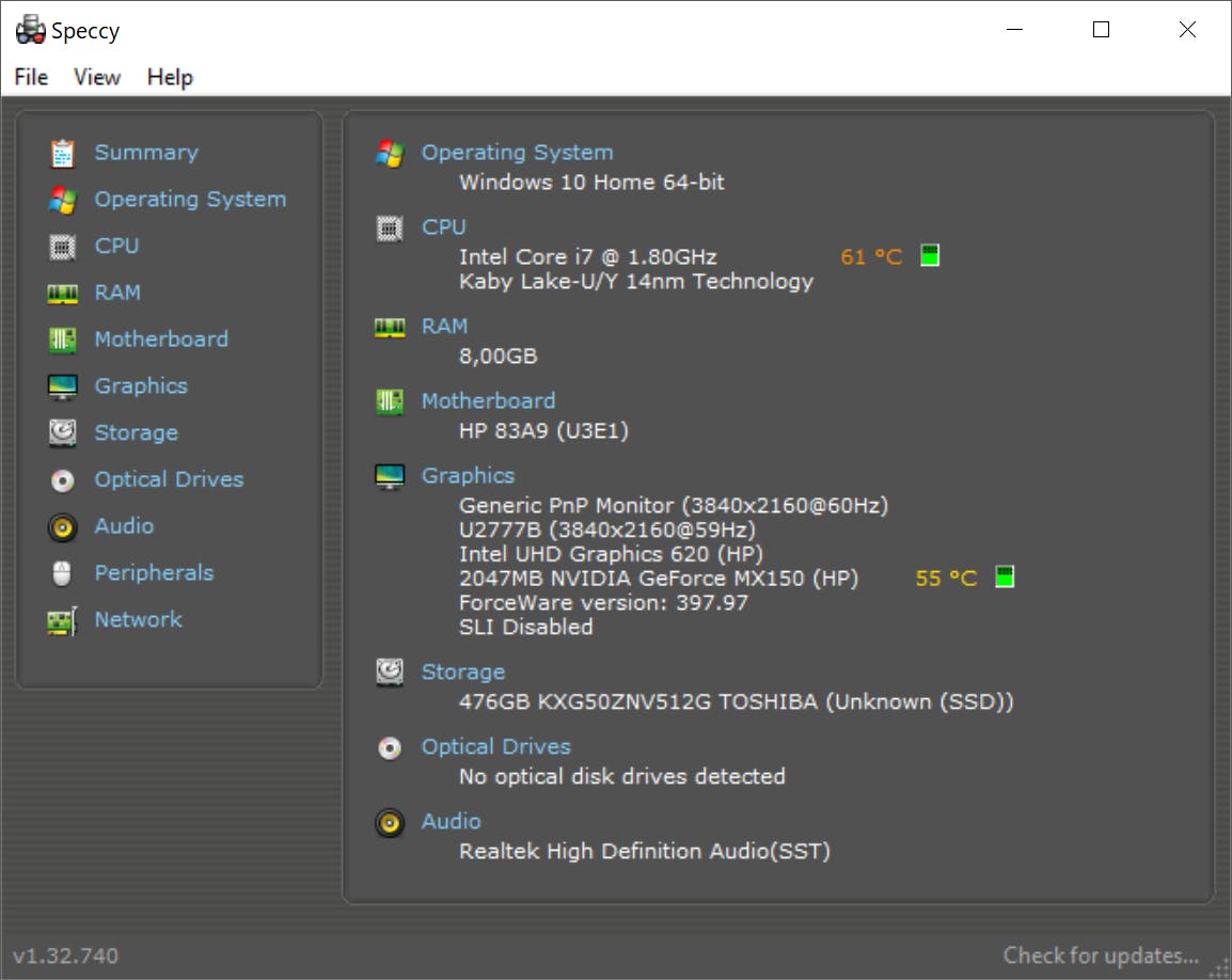 Uiteraard is het wat lastig om te zien of ‘onder de motorkap’ wel alles conform je bestelling is geleverd. Komen type processor, hoeveelheid opslaggeheugen, grootte ssd, type grafische kaart en andere zaken wel overeen met wat je besteld had? Met het gratis Speccy wordt je pc helemaal doorgelicht en krijg je een gedetailleerd rapport waarop alle onderdelen en hun specificaties zijn terug te vinden.