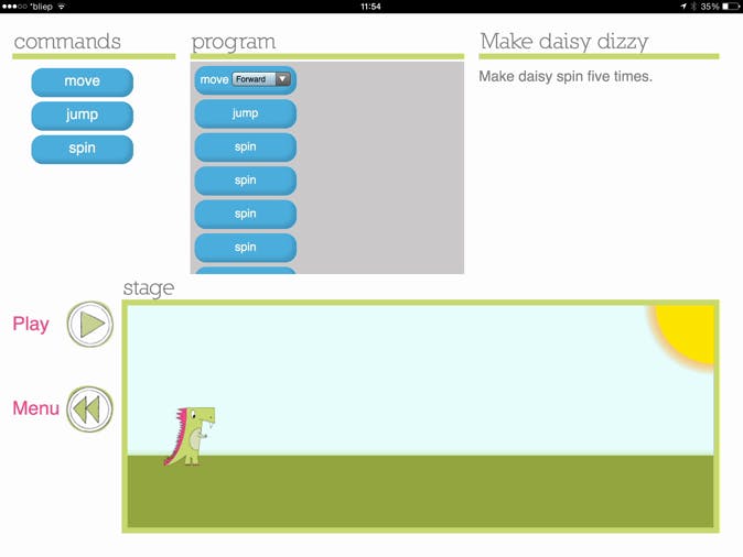 Met eenvoudige puzzels leert het kind in de app Daisy the Dinosaur spelenderwijs programmeren op de iPad.