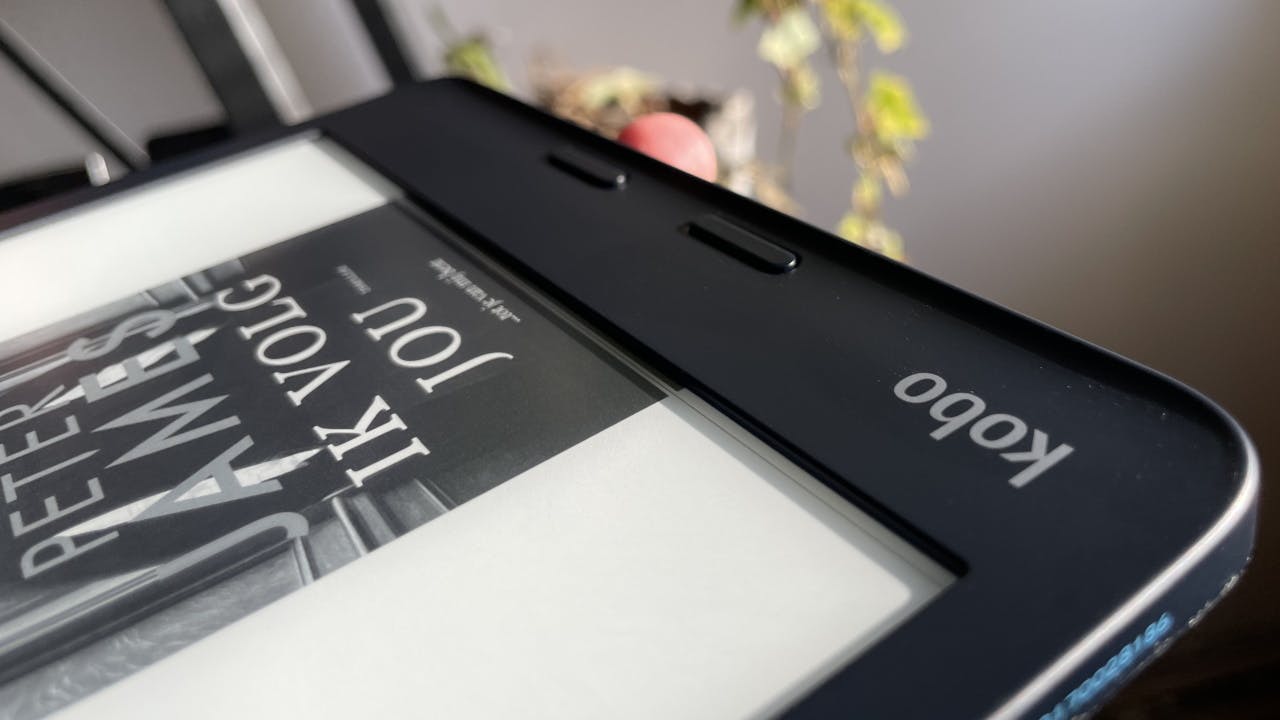 Als e-reader zelf is de Kobo Libra erg handzaam. Dankzij z’n 7 inch schermpje doet hij qua formaat een beetje denken aan een iPad Mini. De Kobo reader houdt ook wat prettiger vast door zijn lage gewicht, wat een pluspunt is voor de echte boekenwurm die zich vele uren kan verliezen in een goed boek. Aan de rechterzijde is een kromme rand waaraan je de reader makkelijk vasthoudt – en met de twee fysieke knoppen de bladzijde omslaat. Dat kan overigens ook gewoon met een tikje op het touchscreen. Fijn is dat je de reader gewoon omdraait, om de rand aan de linkerzijde te krijgen (voor linkshandigen) of om de rand onder het scherm te hebben. Persoonlijk is dat voor mij de meest comfortabele leeshouding, hoewel de pagina’s dan wel iets minder verticale ruimte hebben en dat leidt tot kleinere letters.