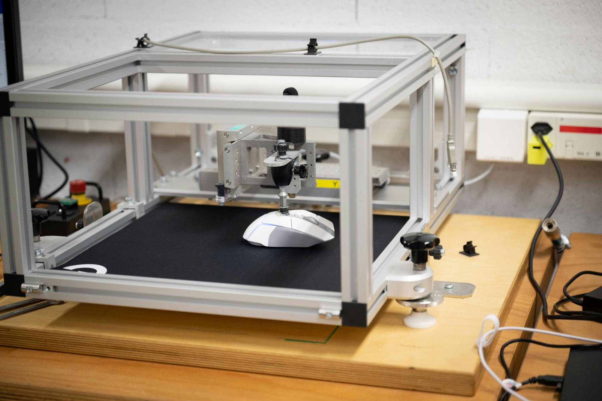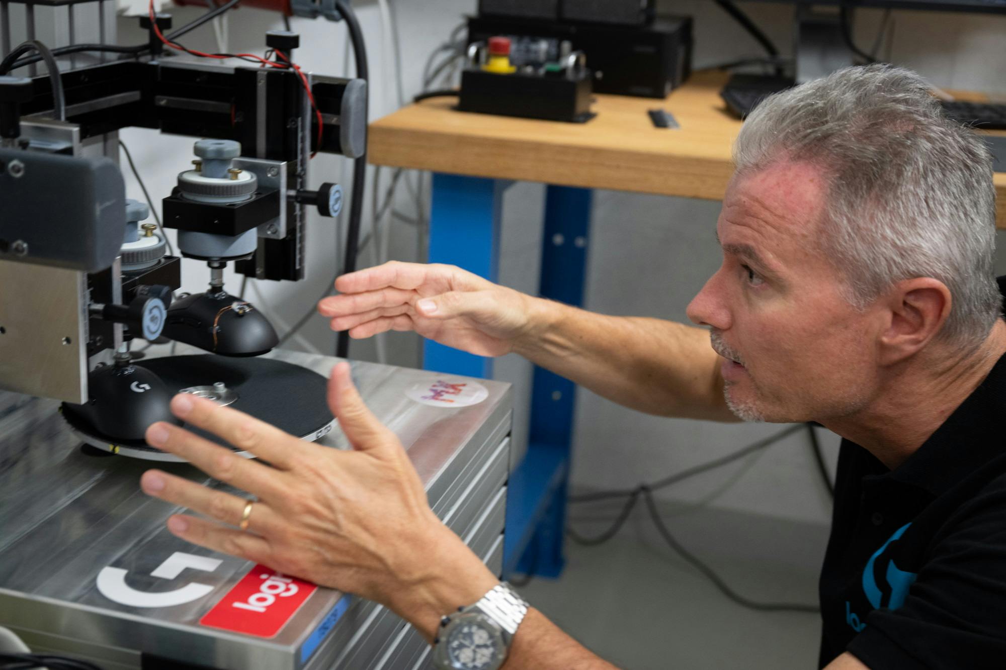 Omdat niemand voor dergelijke tests heel de dag met een muis wil slepen en het bovendien heel erg last is om constant dezelfde beweging te maken, heeft Logitech zelf diverse apparaten gemaakt waarmee de levensduur en het gedrag van knoppen en sensoren getest worden. In het laboratorium liggen verpakking van bijvoorbeeld platenspelers die vermoedelijk als basis dienen voor sommige van de ontworpen apparaten.