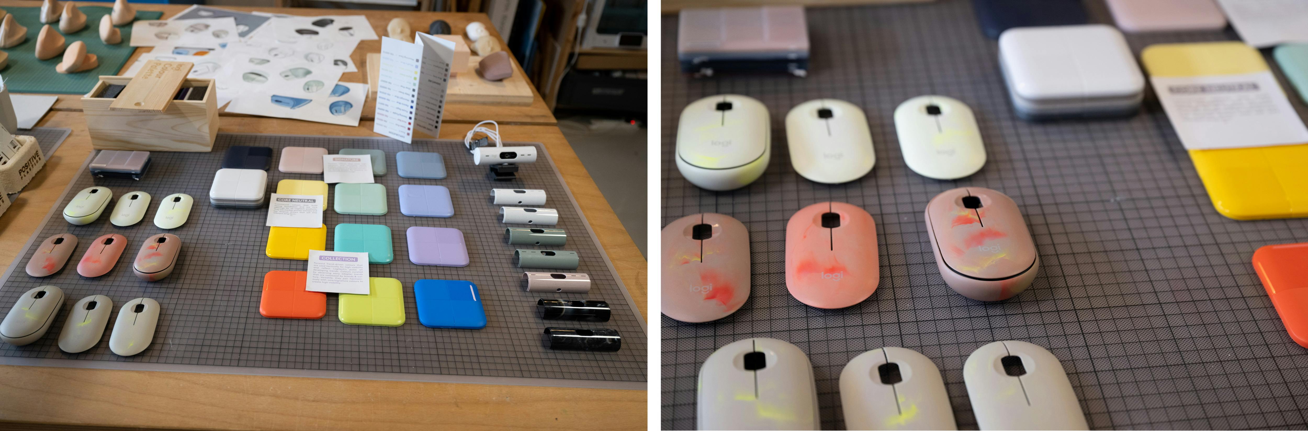In samenwerking met plasticleveranciers heeft Logitech daarom gewerkt aan kunststoffen in een groot aantal verschillende kleuren die voor een groot gedeelte bestaan uit pcr. Van al die kleuren zijn er stalen op de ontwerpafdeling aanwezig zodat de ontwerpers precies weten welke kleuren er mogelijk zijn. Momenteel heeft Logitech de beschikking over dertig verschillende kleuren die voor een groot deel uit pcr bestaan. Die lichtere kleuren zijn overigens niet volstrekt homogeen, zo kun je in de lichtere kleuren zoals roze spikkels van donkere kleuren zien.