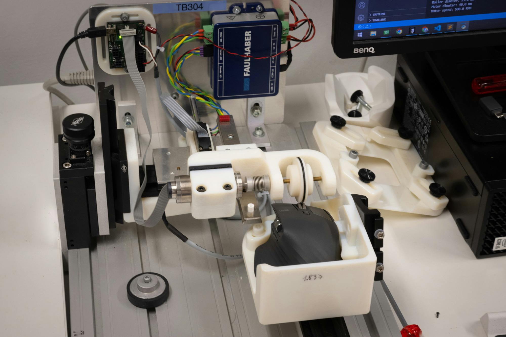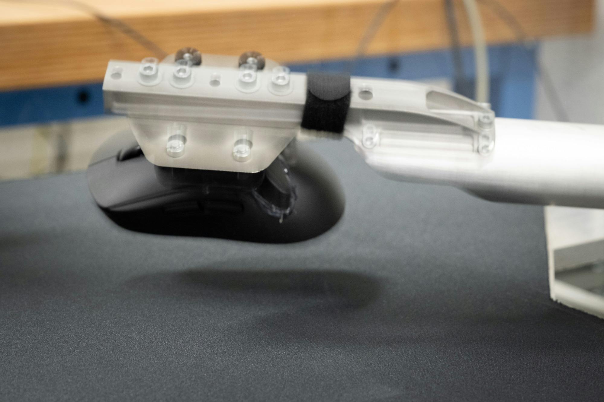Een andere machine die ook wordt gebruikt voor het testen van de tracking is voorzien van een arm die de muis na een muisbeweging optilt en weer neerzet. Hiermee wordt gesimuleerd wat een gebruiker doet als hij het einde van zijn bewegingsvrijheid heeft bereikt, maar de cursor nog een stukje verder wil bewegen.