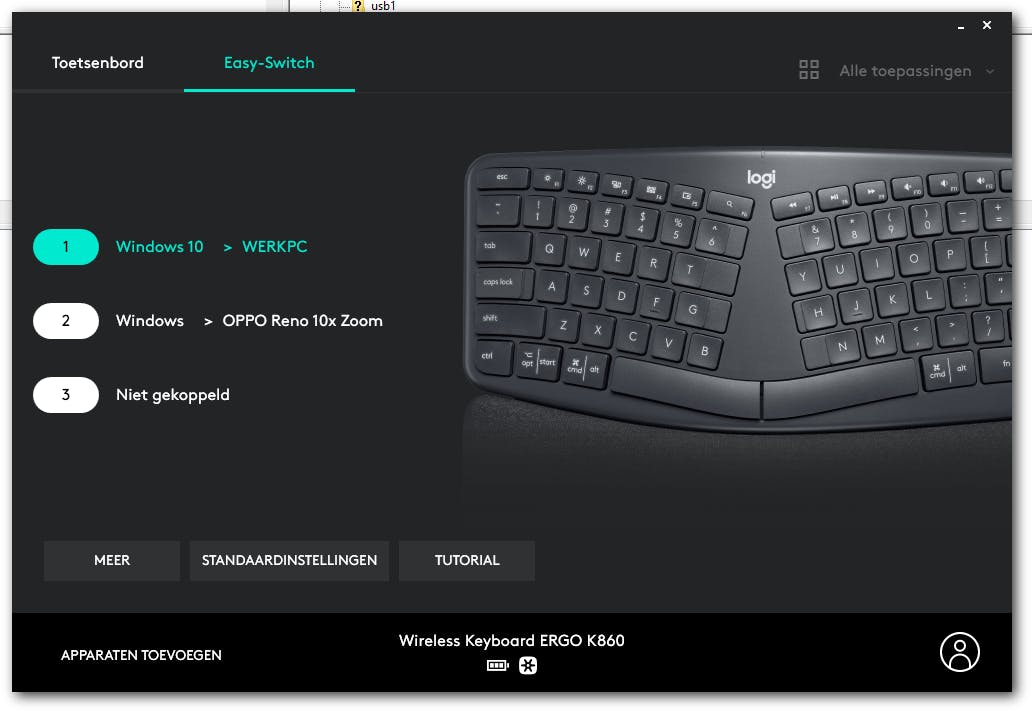 **Prijs** € 129,- **Besturingssysteem** Windows 8 of 10, macOS 10.13 of nieuwer **Batterijen** 2xAAA **Gewicht** 395 gram **Aansluitingen** 2.4 GHz USB receiver, Bluetooth low energy technology **Afmetingen** 233 x 456 x 48 mm **Gewicht** 1160 gram **Kabellengte** 2.5 m pc-kabel/ 1.5 m console kabel **Website** [www.logitech.com](https://www.logitech.com/nl-nl/products/keyboards/k860-split-ergonomic.html)