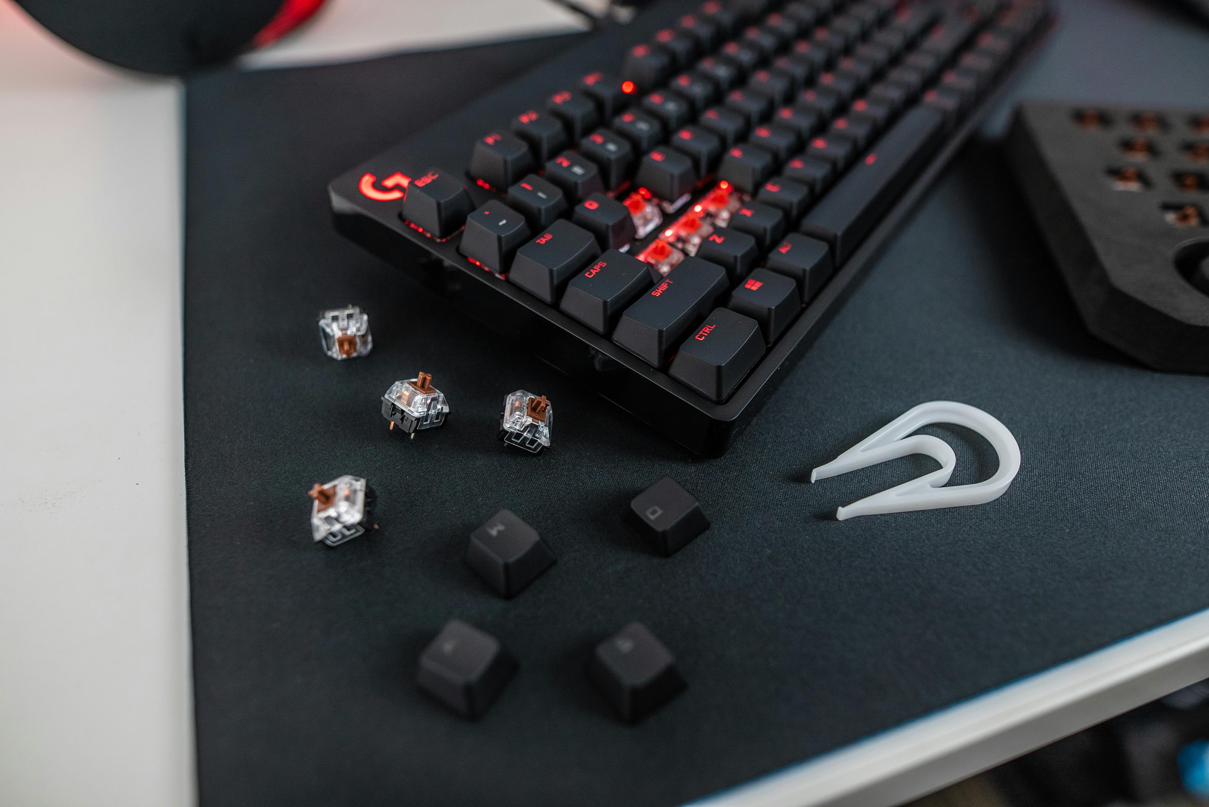 In totaliteit kun je kiezen uit drie verschillende schakelaars. GX Blue heeft een traditionele hoorbare en voelbare klik. De GX Brown is ontworpen voor wedstrijden en heeft een minder hoorbare klik met voelbare feedback. De GX Red is stil en heeft een vloeiende aanslag, ideaal tijdens het live streamen. Verwisselen van de toetsen gebeurd via een tang die Logitech mee levert bij een set nieuwe schakelaars. Deze druk je om de schakelaar heen zodat deze los komt van het toetsenbord. Vervolgens kun je de nieuwe schakelaar op zijn plek duwen.