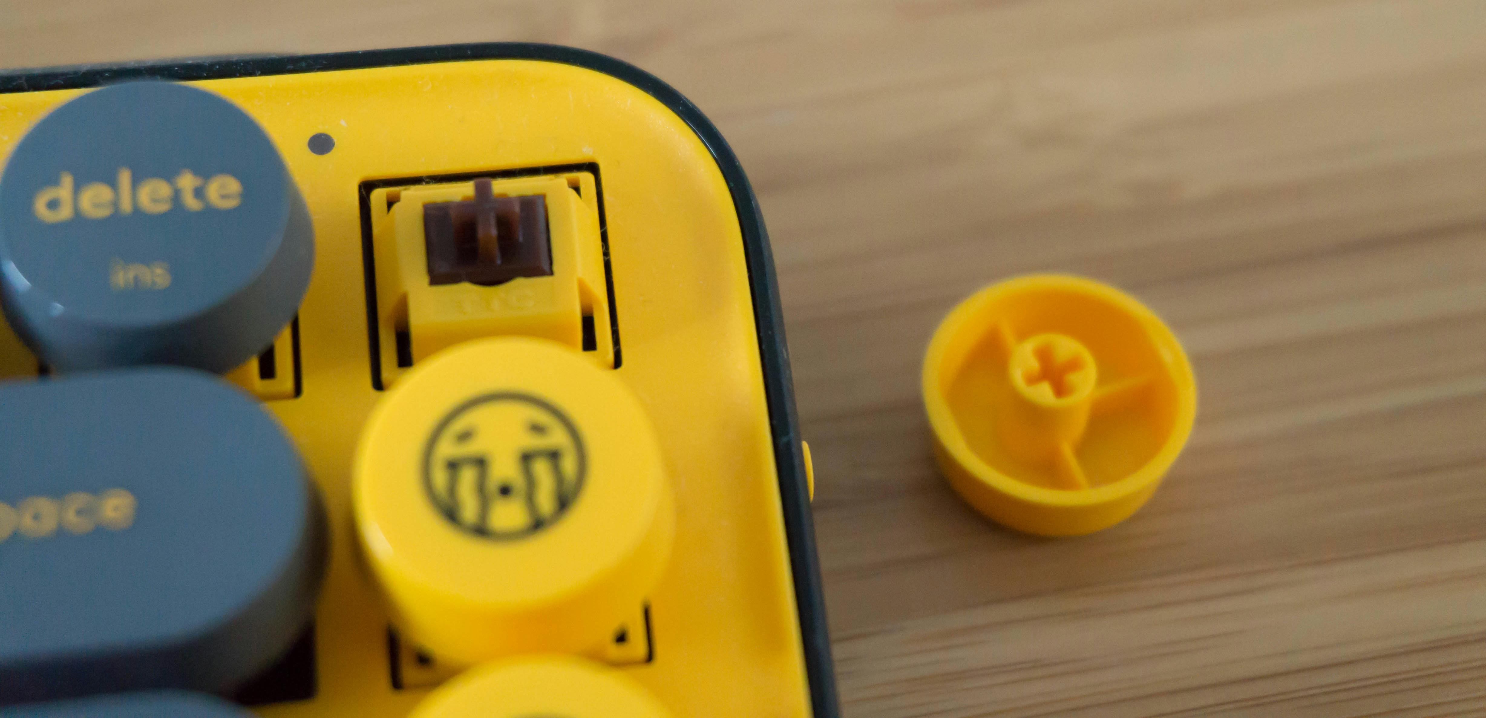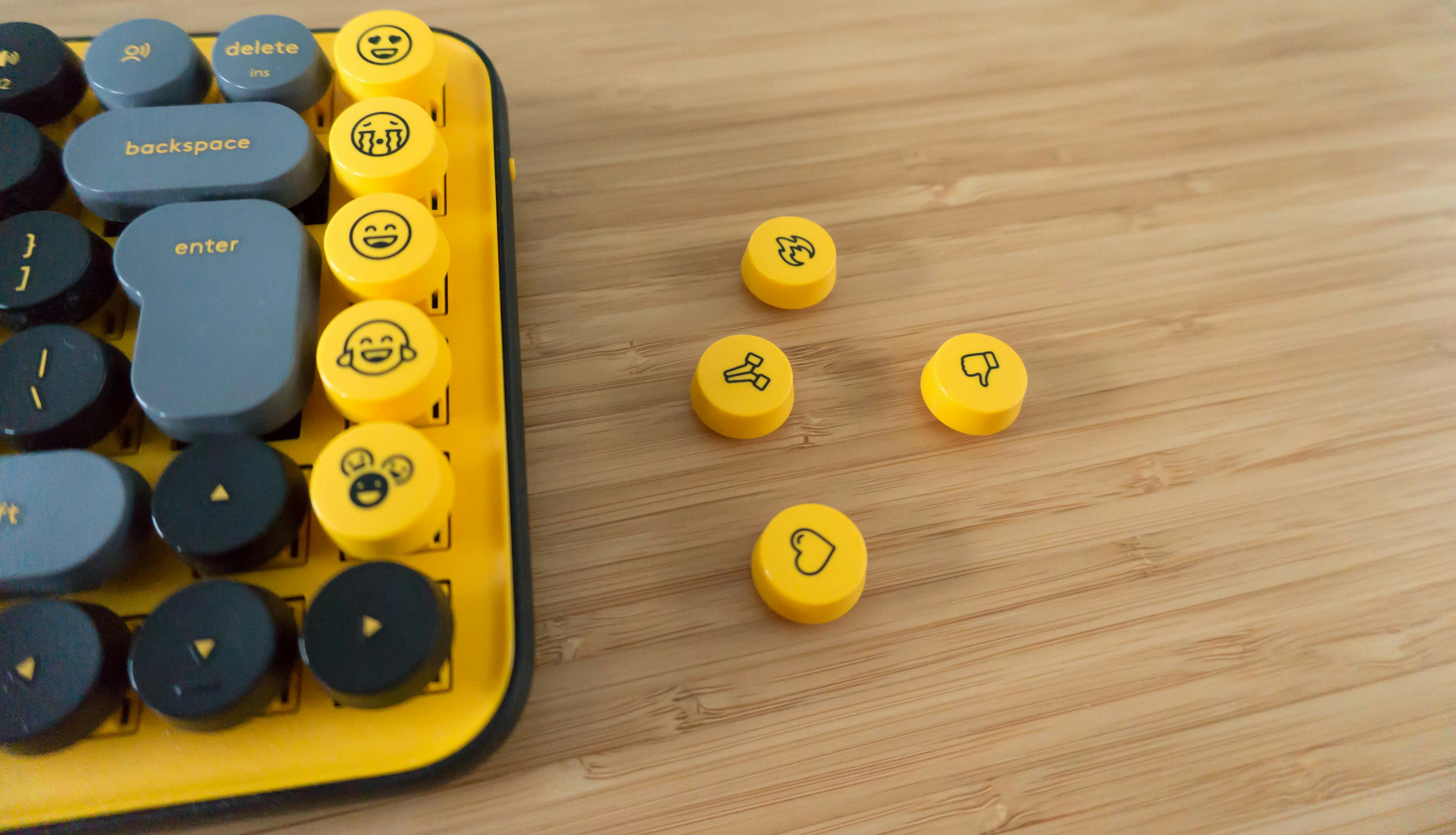 Behalve door de ronde toetsen, valt de Pop Keys ook op door de vijf emoji-toetsen met daarop de volgens Logitech vier meest gebruikte emoji. Naast de vier standaard emoji worden er nog vier extra emoji-toetsen meegeleverd. Omdat de toetsen aan de zijkant van het toetsenbord zitten en er door de ronden toetsen veel ruimte tussen de toetsen aanwezig is, is het eenvoudig om een toets los te trekken zonder dat je daar een keycap-puller voor nodig hebt.