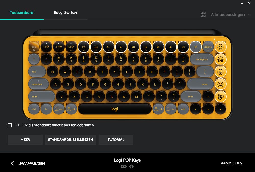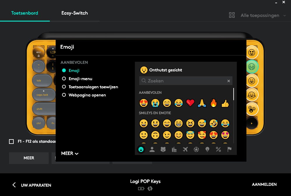 Wanneer je Logitech Options hebt geïnstalleerd dan worden automatisch de standaard geplaatste emoji's toegekend aan de toetsen. Je kunt zelf kiezen voor andere emoji, bijvoorbeeld die van andere vier meegeleverde toeten. Daarnaast kun je ook andere functionaliteit aan de toetsen toekennen, zoals toetscombinaties, te starten programma's of speciale toetsen als Page Up die op dit toetsenbord ontbreken.