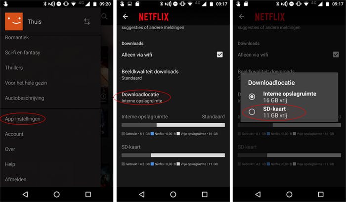 Downloaden naar een geheugenkaartje (indien aanwezig) is aan te raden wanneer de interne opslagruimte van je mobiele apparaat beperkt is. Op een sd-kaartje past meer, dus dat is de ideale plek voor HD-films en series van Netflix.