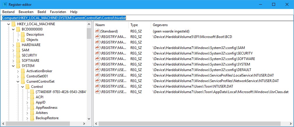 Zodra je het register met Regedit hebt opgestart, zie je in het linkervenster de vijf hoofdsleutels te zien in de vorm van een boomstructuur, waarbij elk item op een steeds lager niveau sleutels, subsleutels en ingangen bevat. Die ingangen verschijnen in het rechtervenster van Regedit en worden gekenmerkt door een naam, een gegevenstype en de eigenlijke data. Er zijn zes verschillende gegevenstypes, maar bij het tweaken kom je vooral met twee types in aanraking: tekenreekswaarden (een tekenreeks met variabele lengte) en dword-waarden (een ‘double word’ oftewel een waarde van 32 bits, vaak gebruikt voor schakelopties als 0 (uit) en 1 (aan)). Net zoals in het navigatievenster van de Verkenner is het voldoende om te dubbelklikken op het item om dieper in de boomstructuur te kunnen afdalen. Zolang je geen wijzigingen aanbrengt, is het volkomen veilig om zo het register te benaderen. Ga bijvoorbeeld maar eens op zoek naar de schijflocatie van de Windows-hives te zien. Dubbelklik achtereenvolgens op HKEY_LOCAL_MACHINE / SYSTEM / CurrentControlSet / Control / Hivelist.