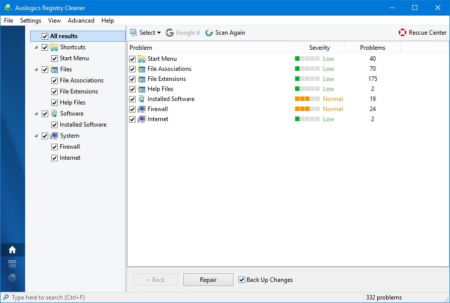 Er zijn verschillende gratis registercleaners, waaronder CCleaner en Auslogics Registry Cleaner. We bekijken even deze laatste. Verwijder tijdens de installatie het vinkje naast alle onderdelen die je niet mee wilt installeren. Start de tool op en klik op Scan Now. Na afloop kun je de gevonden ‘problemen’ bekijken en eventueel bepaalde vinkjes weghalen. Controleer of er wel degelijk een vinkje staat bij Back Up Changes en druk vervolgens op Repair. Gaat er onverhoopt toch iets fout, open dan het menu File en kies Rescue Center. Selecteer de gemaakte back-up, klik op Restore en op Yes.