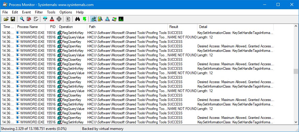Het is overigens ook mogelijk in realtime na te gaan wat er allemaal in het register gebeurt. Ook hiervoor bestaan enkele tools, waaronder Sysinternals Process Monitor. Pak het gedownloade zip-bestand uit en start de portable tool op. Zorg ervoor dat in de knoppenbalk alleen het knopje Show Registry Activity is geselecteerd (de vijfnalaatste in de rij): in de statusbalk onderaan zie je het aantal registeractiviteiten. Handig is nog het vizierknopje: wanneer je dat naar een open programmavenster versleept, worden alleen de (register)activiteiten van die applicatie getoond. Om je een idee te geven: onze eigen Word-applicatie zorgde voor zo’n 20.000 registerwijzigingen binnen zo’n vijf minuten. Gelukkig bevat het programmaatje een aantal krachtige filteropties zodat je toch je weg kunt vinden binnen de ontstellende hoeveelheid informatie. Ga naar het menu Filter, kies Filter en vul de gewenste filtercriteria in. Je zal al snel merken: Process Monitor mikt vooral op de doorwinterde gebruiker.
