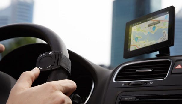 Standaard wordt er een kleine afstandsbediening meegeleverd die je op het stuur kunt monteren. Deze kleine afstandsbediening maakt automatisch verbinding met de tablet en beschikt over een rond touch-gedeelte met daaromheen vier knoppen. Met deze knoppen kan er gekozen worden tussen de verschillende bronnen. Ook kan hiermee het volume en de muziek geregeld worden. Een gemiste kans is dat je hiermee niet de gehele tablet kunt bedienen maar slechts enkele (standaard-)functionaliteiten.