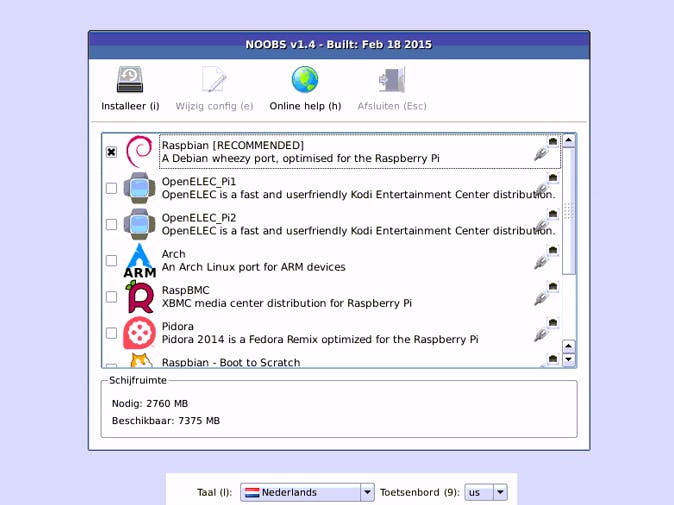 We gaan ervan uit dat je in de basiscursus over de Raspberry Pi 2 het besturingssysteem Raspbian met de hulp van NOOBS hebt geïnstalleerd. Heb je een ander besturingssysteem met NOOBS geïnstalleerd, zoals OpenELEC, dan is dat eenvoudig terug te draaien. Steek de voeding van je Raspberry Pi in een stopcontact en houd onmiddellijk de Shift-toets ingedrukt om het installatieprogramma opnieuw te openen. Staat er nog helemaal geen besturingssysteem op de microSD-kaart van je Pi, kijk dan in de basiscursus hoe je NOOBS installeert en start je Pi ervan op.