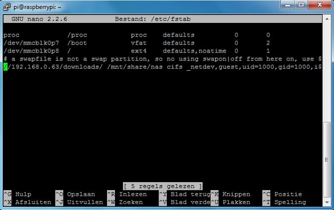 Voer de opdracht sudo nano /etc/fstab uit en voeg onderaan de regel //192.168.0.63/downloads /mnt/share/nas cifs guest,uid=1000,gid=1000,iocharset=utf8 0 0 toe. Indien je niet met gasttoegang werkt, gebruik dan username=gebruiker,password=wachtwoord in plaats van guest, waarbij je uiteraard de juiste waardes invult. Druk op Ctrl+X om nano af te sluiten, druk op J om de wijzigingen op te slaan en bevestig met Enter. Voer daarna sudo mount -a uit om de netwerkshare te koppelen. Voer de opdracht sudo nano /etc/rc.local uit, plaats de opdracht mount -a vóór de regel exit 0 en sla deze wijziging op.