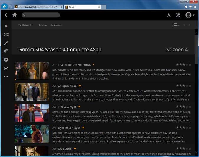 Aan de linkerkant zie je de bibliotheken die je juist toegevoegd hebt. Klik op een bibliotheek om meer te zien. Zo kun je bij tv-series bovenaan kiezen om je media per tv-serie, per seizoen of per aflevering te bekijken. Klik je rechtsboven op het icoontje met de negen vierkantjes, dan kun je kiezen uit de weergave van posters, details en een lijst. In principe kun je in deze webinterface ook media afspelen, maar in het pakket van de Plex Media Server van uglymagoo was tijdens onze test transcoding niet goed geconfigureerd. Andere clients werken wel, maar voorlopig zonder ondertitels.