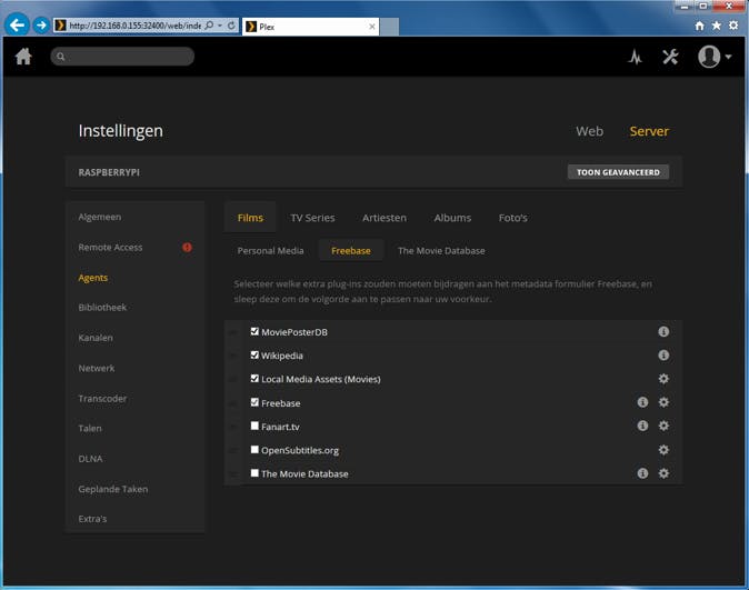 Heb je een Plex-account, klik dan in de webinterface van je Plex Media Server rechtsboven op het icoontje van de instellingen, ga dan naar Server, geef in het tabblad Algemeen je gebruikersnaam en wachtwoord in en klik op Log in. In dit tabblad verander je ook de naam waaronder je Plex Media Server bij de clients beschikbaar is en kies je of je Raspberry Pi automatisch controleert of er updates beschikbaar zijn. Klik je rechtsboven op Toon geavanceerd, dan krijg je meer instellingen te zien, met Verberg geavanceerd zie je daarna weer enkel de basisinstellingen.