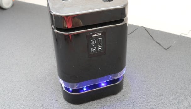 Het uiterlijk van de BoomBoom 380 kent twee gezichten. De eerste blik die we werpen op de plastic speaker geeft ons geen brede lach op het gezicht. De 28 centimeterhoge zwarte speaker straalt geen klasse uit en de besturingsknoppen zien er goedkoop uit. Die uitstraling verandert als je verbinding maakt met de speaker. Tussen het onderstuk en middenstuk komt een neonblauwe gloed tevoorschijn, die het product een vrolijkere look geeft. De speaker zelf is niet zichtbaar, die zit netjes verscholen onder het middenstuk.