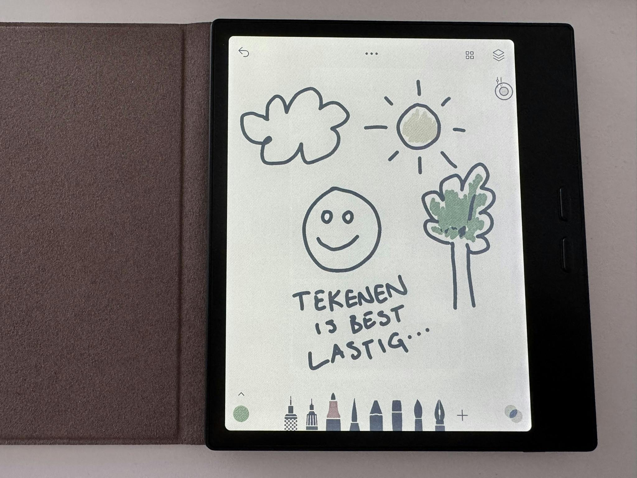 Omdat het apparaat op Android draait en toegang heeft tot de Play Store, kun je er ook creatieve tekenapps zoals Sketchbook of Tayasui Sketches op zetten. In theorie klinkt dat ideaal, maar in de praktijk valt het toch een beetje tegen. Er zit merkbare vertraging tussen je penbewegingen en wat er op het scherm verschijnt, en de drukgevoeligheid werkt niet altijd gelijkmatig. Voor snelle schetsen of nauwkeurig tekenwerk is dat hinderlijk, waardoor deze e-reader duidelijk geen volwaardig alternatief is voor een tablet of digitaal schetsboek.