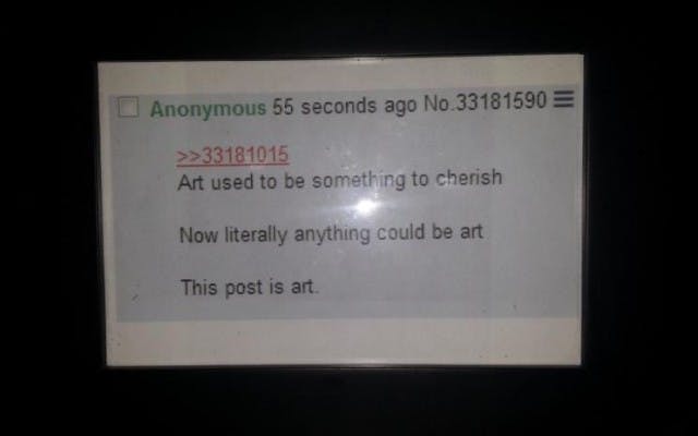 Op de website FunnyJunk is te lezen hoe het zo ver heeft kunnen komen. De origine van de screenshot is een anonieme internetpost in een discussie over kunst. Een andere anonieme gebruiker printte deze uit en zette het 'kunstwerk' daarna op eBay. "En ik ga er op bieden ook," zegt vervolgens iemand anders.