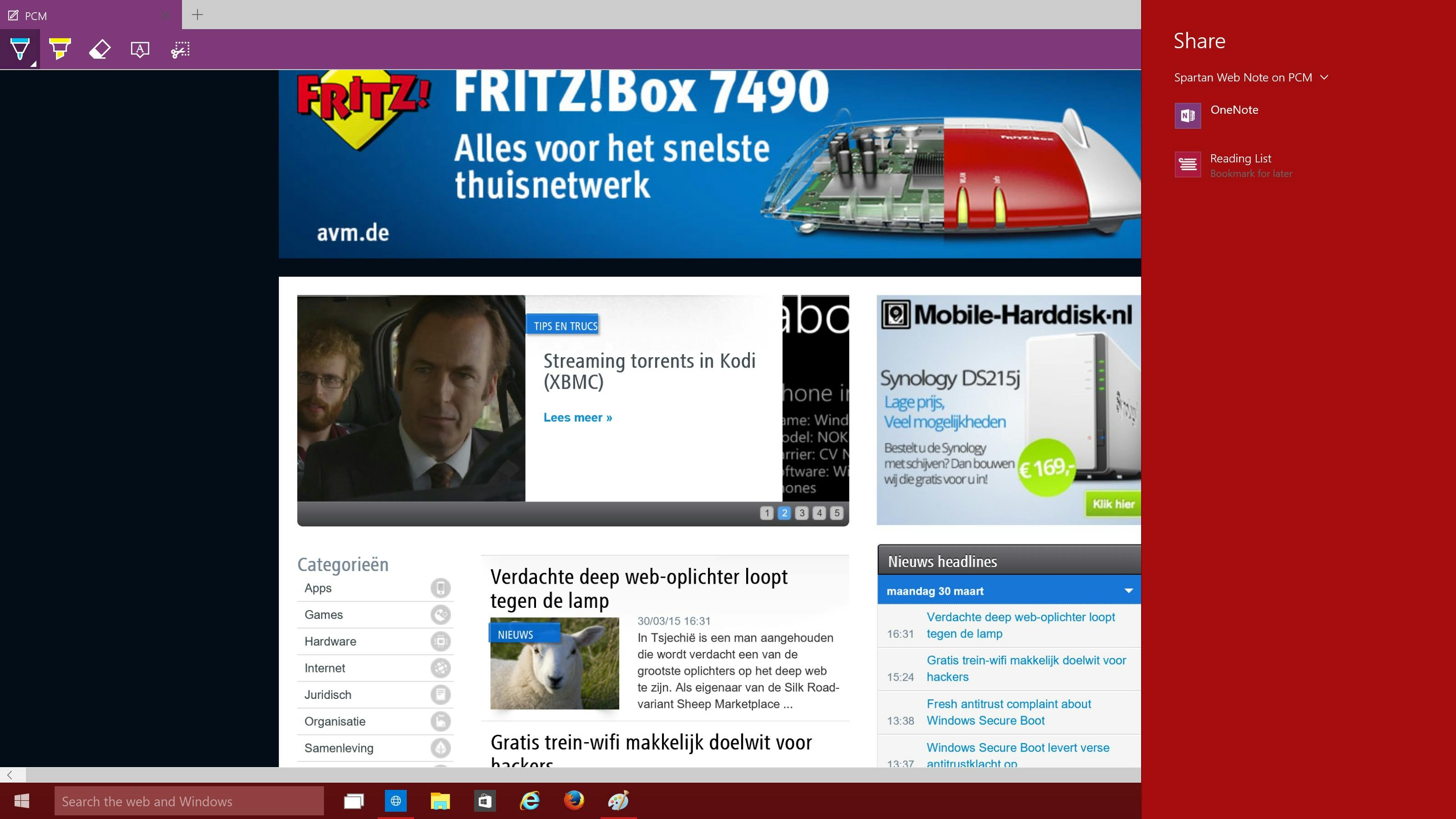 Net zoals in de rest van Windows 10 zit Cortana ook ingebakken in Spartan. De slimme zoekassistent is voorlopig alleen beschikbaar in Amerika, maar dat heb je snel gefixt door je systeem op die regio te zetten. Niet alle functies in Cortana werken nog - zo is het nog niet mogelijk om afspraken te maken vanuit de browser.