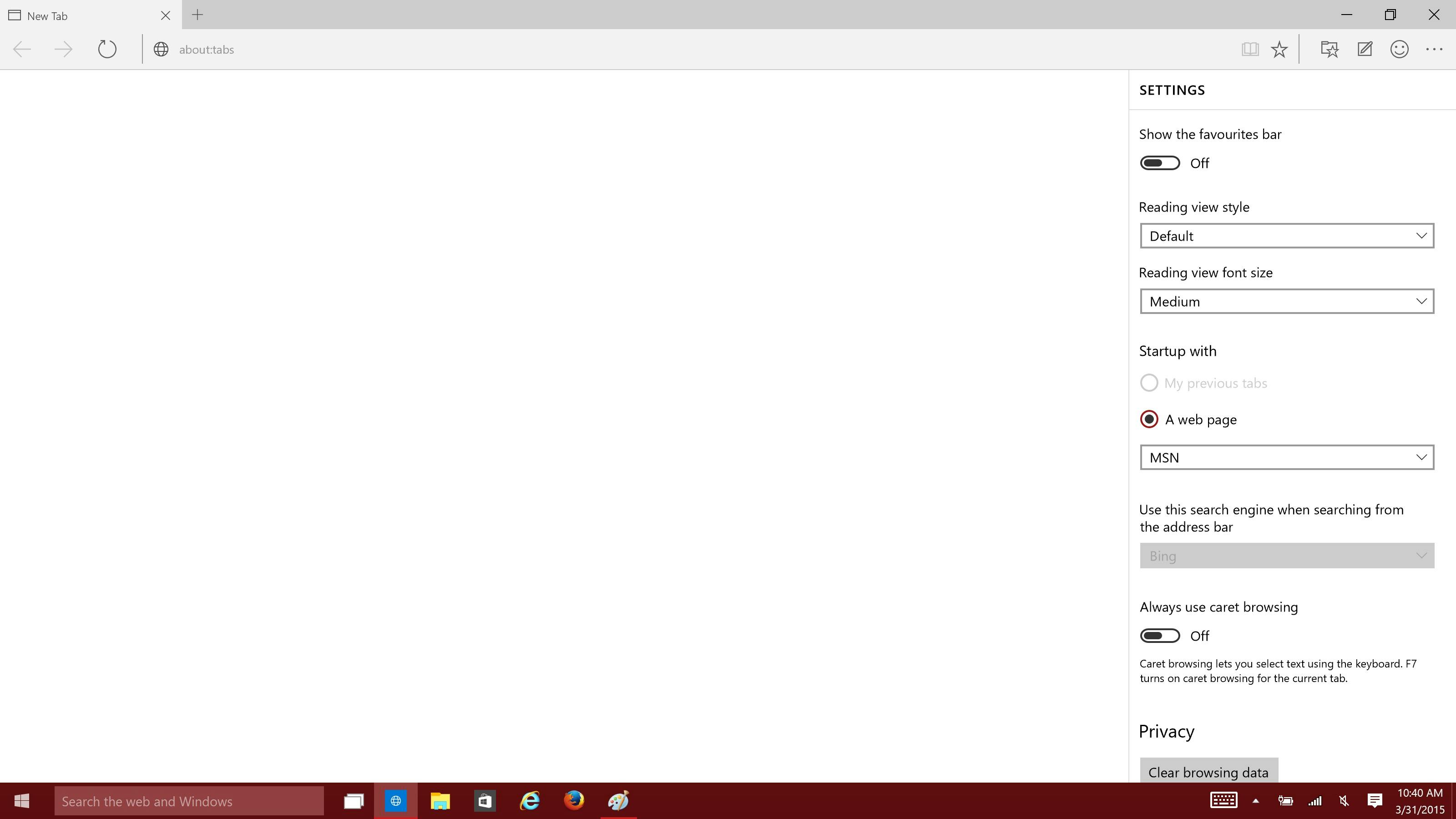 Het eerste dat opvalt is het uiterlijk van de browser. Die heeft namelijk precies dezelfde stijl als de rest van Windows 10, en dan met name de menu's. Het schermvullende raam heeft dezelfde minimalistische stijl als het Settings-menu van Windows 10. De tabbladen in de bovenste balk zijn strak vierkant, en er wordt geen onnodige ruimte ingenomen in de bovenste balk.