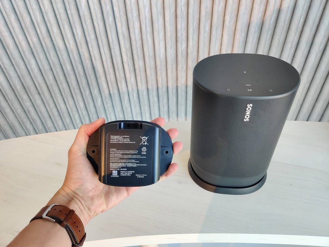 Dit geldt ook voor de geluidskwaliteit, want dat is lastig oordelen in een grotere testruimte met tientallen andere genodigden en bijbehorende omgevingsgeluiden. Wat opvalt is dat de Move bijzonder luid kan, meer dan luid genoeg om een flinke woonkamer te vullen. Het geluid klinkt goed en dat mag geen verrassing zijn, want Sonos-speakers staan bekend om hun fraaie tonen. Voor de liefhebber: de Move heeft twee D-klasse versterkers, één tweeter die naar beneden is afgesteld en één midwoofer. Dat is voor een speaker in dit prijssegment niet bijzonder, maar specificaties zeggen niet alles.