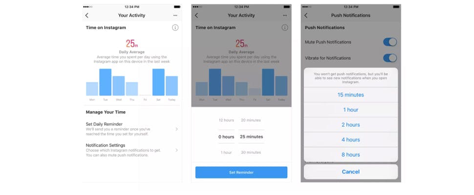 Mocht je daar niet genoeg van schrikken, dan heb je opties om het gebruik van Instagram te beperken. Zo kun je een tijdslimiet instellen, je krijgt dan een melding zodra het tijd is om je telefoon weg te leggen. Ook vind je er de mogelijkheid meldingen te dempen.